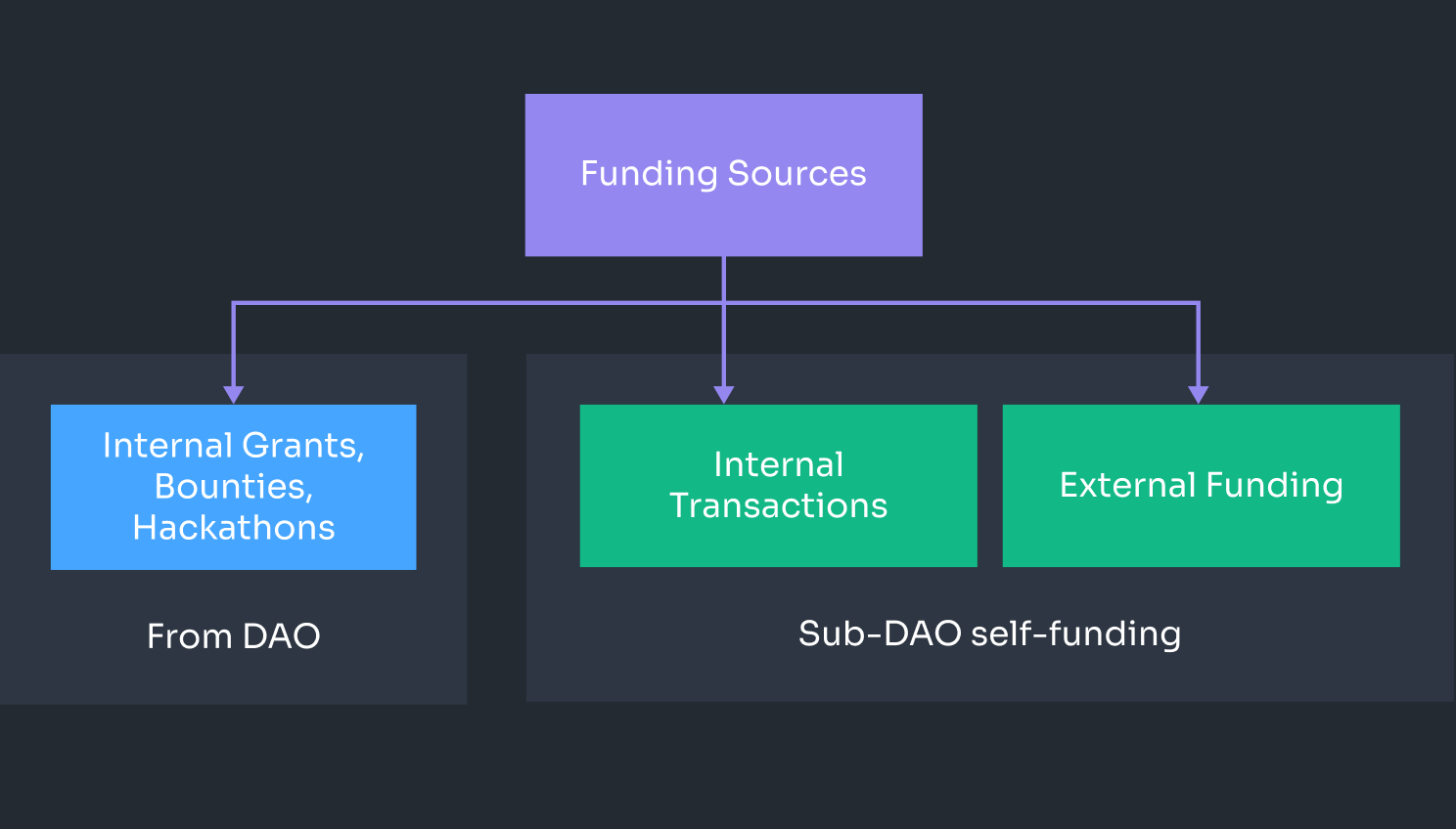 Another approach is self-funding. The sub-DAO can perform services for other sub-DAOs and get paid directly or provide services externally. For example, a design sub-DAO can act as an internal studio and work for multiple DAOs.
