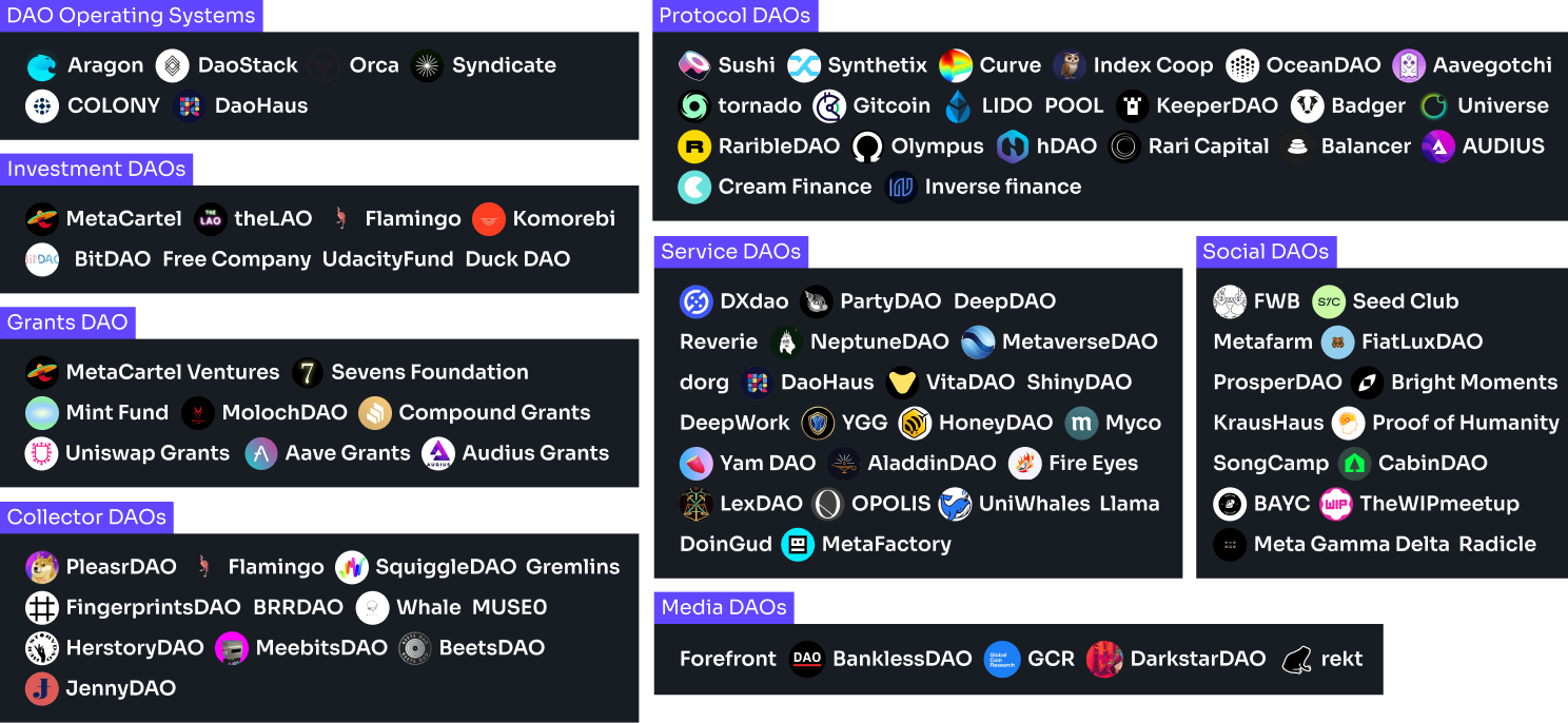 Below are some of the many DAOs at the frontier of the crypto revolution. They are widespread from Social DAOs to Protocol DAOs and beyond. You may have heard of some of the more popular DAOs in the landscape such as Sushi and BAYC. Each of these DAOs operates differently with a unique structure, voting mechanism and goal.