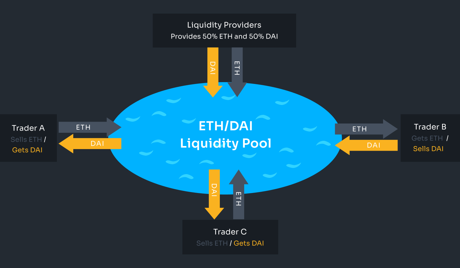 If a user wishes to swap ETH to DAI, they will trade on the ETH/DAI liquidity pool by adding ETH and removing an amount of DAI determined algorithmically from the liquidity pool.