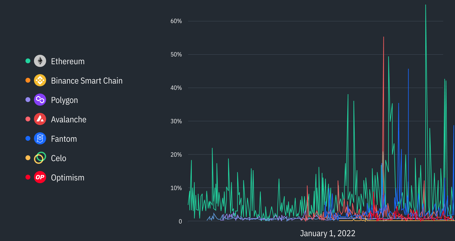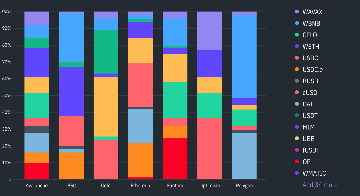 Continuing to dive into the data, we can see the most popular tokens purchased on each chain. Avalanche has a wide distribution compared to other chains, but WAVAX takes the cake with 21% of the total volume without surprise. On BSC, BUSD and WBNB dominate the market, each at around 26% of the volume. Celo has less trade diversity, with CELO and cUSD accounting for 87% of total trades combined. Ethereum is well divided with USDC, WETH and “other,” each occupying large volume shares. In this case, “other” refers to tokens not in the top 10 in trade volume, showing the diversity of trades on the Ethereum mainnet. For Fantom, Optimism and Polygon, USDC conquers the volume charts showing the importance of stablecoins to traders in DeFi.