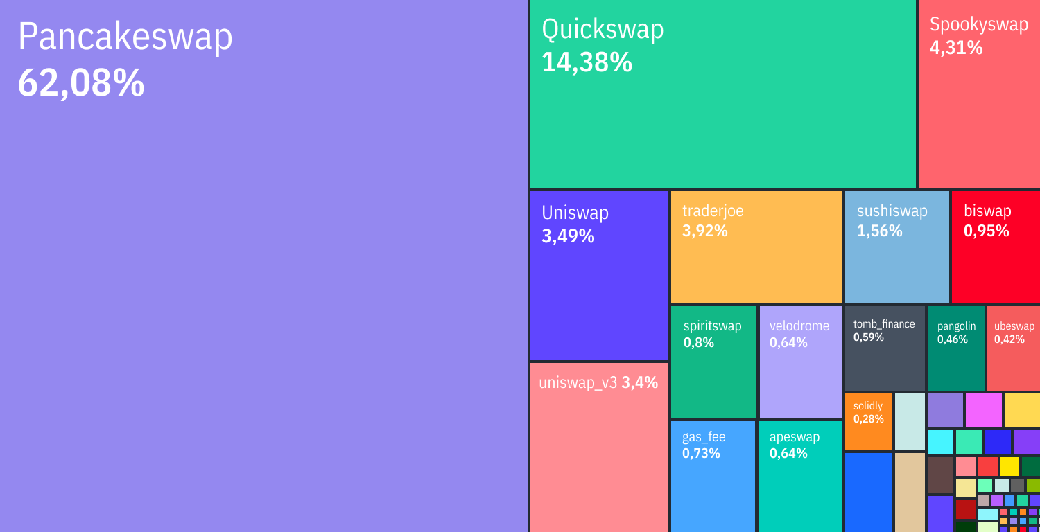 Let’s first look at where DexGuru users made the most transactions. The treemap below shows that a whopping 62.08% of total transactions were routed through Pancakeswap AMMs on BSC, with the Polygon native Quickswap coming in at number two with 14.38% of transactions. Further down, we see Spookyswap on Fantom along with Uniswap v2 and v3, each occupying over 3% of transactions. It looks like DexGuru traders love swapping on Binance Smart Chain!