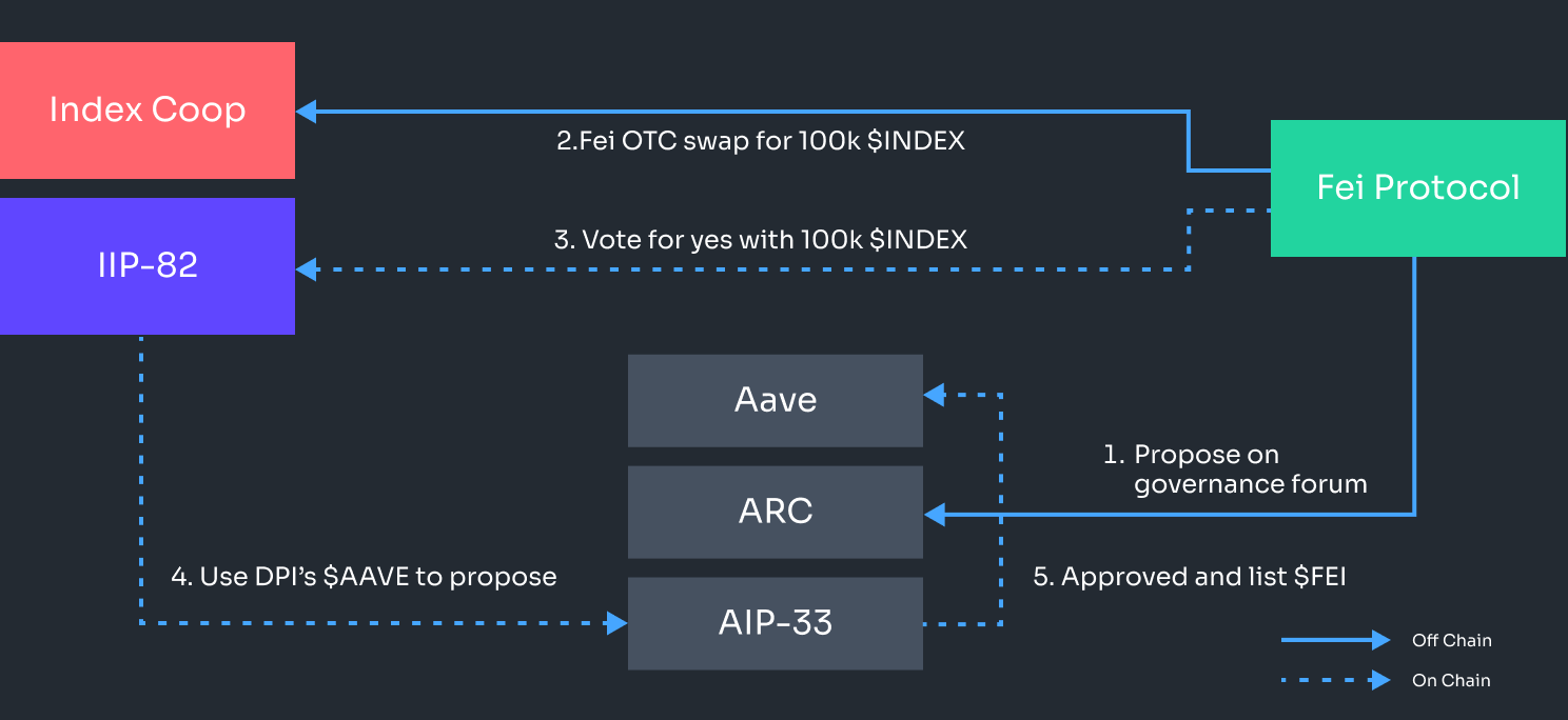 However, for FEI to list on Aave, it had to pass through the money market’s decentralized governance process. Given the lack of certainty in how AAVE holders would vote, as well as the minimum 80,000 AAVE (worth ~$20 million at the time) requirement to make a governance proposal, Fei decided to purchase 100,000 INDEX tokens (worth ~$2.5M at the time) to aid in securing this integration. INDEX is the governance token of the Index Cooperative, an asset management DAO behind the creation of indices and structured products such as DPI (DeFi Pulse Index) and GMI (Bankless DeFi Innovation Index).