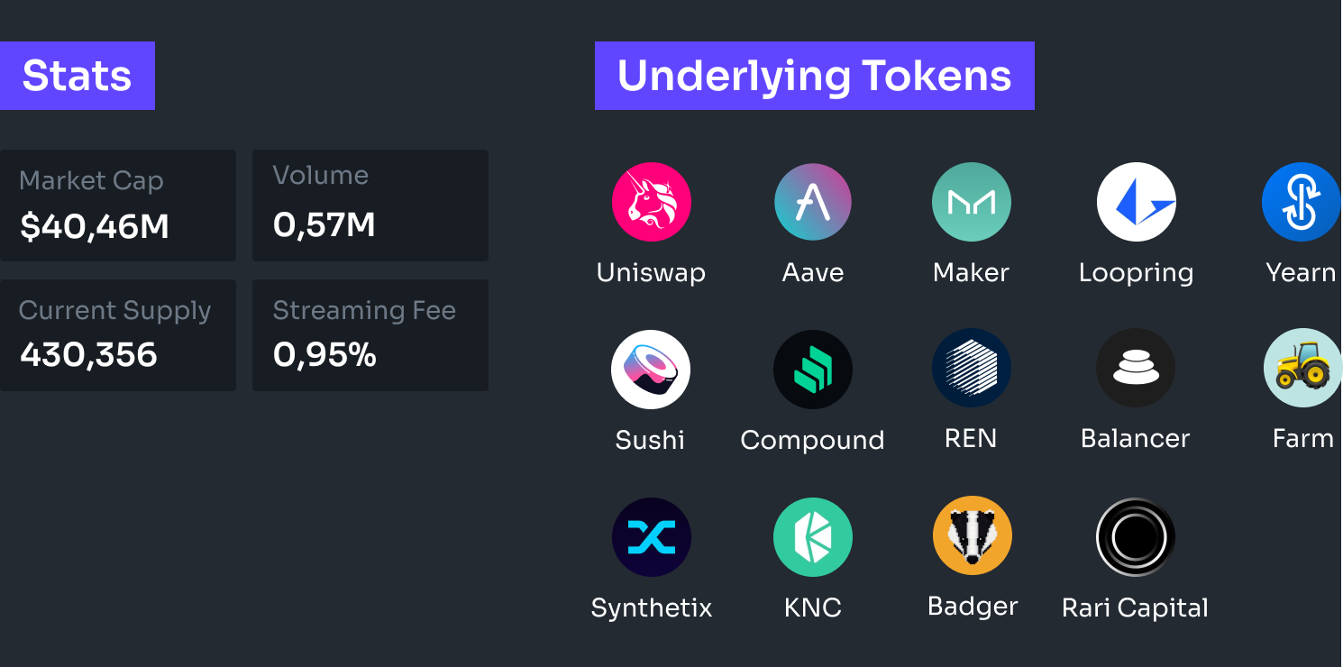 INDEX metagovernance is currently enabled for five assets within DPI: UNI, COMP, YFI, BADGER, and AAVE. Instead of purchasing each token individually, a DAO can purchase INDEX and obtain the governance rights for each underlying asset.