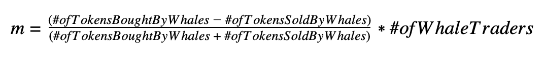 We calculate value m that represents the difference between buy volume and sell volume of Whale 🐳 traders over the last 24 hours. You can see the formula for m below. The m value is similar to the Speculative Sentiment Index. If m value is negative, it means more tokens have been sold than bought. If m is positive, it means more tokens have been bought than sold. When we calculate the Trending tab, we consider the maximum and the minimum m values for the previous 30 days. We use our custom k indicator similar to the stochastic oscillator to determine what tokens are listed in the Trending tab. The k indicator value ranges between 0 and 100. When k is bigger than 60, the token is considered for the Trending tab. The k indicator shows how close the current m value is to the maximum m over the last 30 days.
