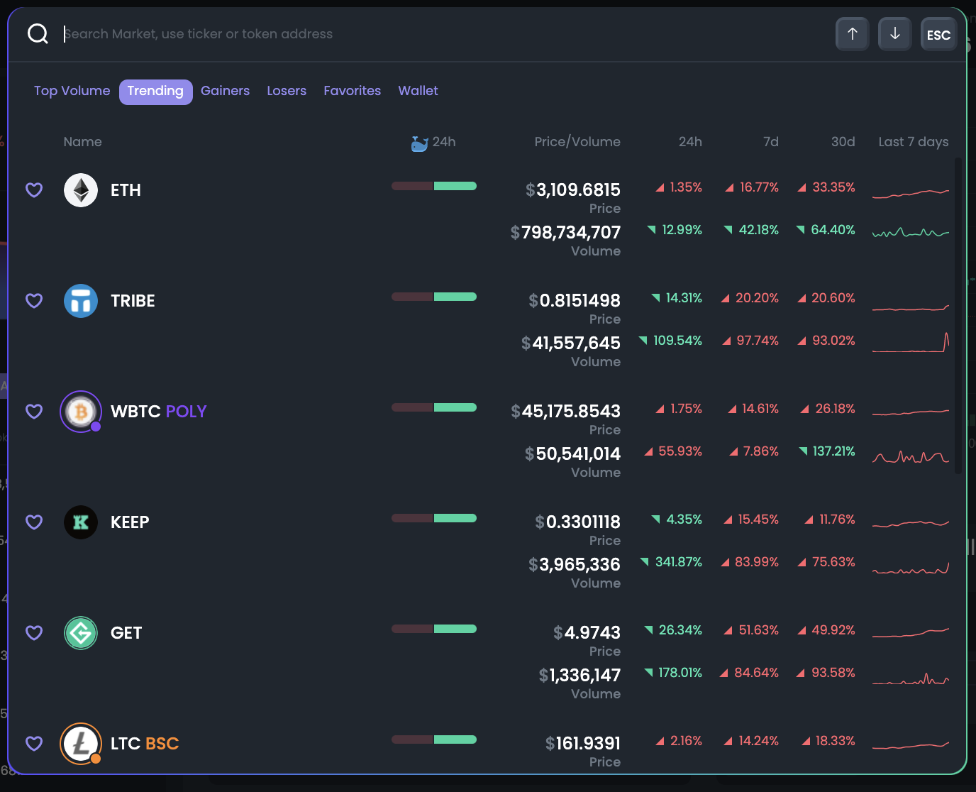 Quickly identify tokens that are currently trending and tokens that are losing or gaining their value