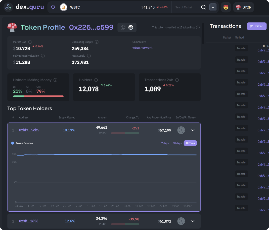 First up is our Token Profile feature that allows you to uncover further details of any Token. You’ll be able to see high level statistics such as Market Cap, Circulating Supply, # of Token Holders, # of Transactions & etc, before being able to deep dive and uncover more, including information regarding the Top 100 Token Holders and seeing if they’re in profit or not!